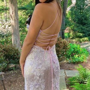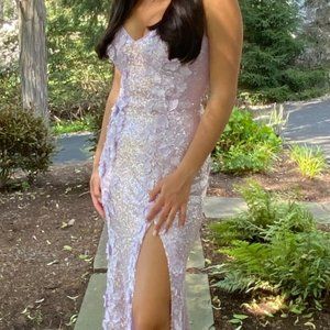 Details: Sequin prom dress with floral appliques, form-fitting silhouette, floor-length skirt with a high slit and sweeping train, spaghetti strap bodice, sweetheart neckline, and open tie back.