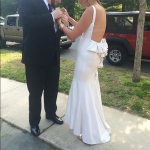 high neckline, fitted silhouette, and open back with ruffled detailing.