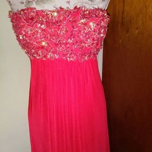 Up for sale is an absolutely stunning fabulous BEYOND Division of Jovani Red Bedazzled beaded applique dress size 8 , zippers in tge back .It has a fiited boned padded bodice and is strapless.Grecian style with full fliwing dress which is lined. Only worn one time, great condition, this dress will light up the room!