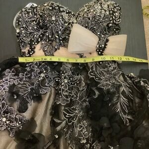 Make a grand entrance in this show-stopping Jovani dress! This strapless fit-and-flare features a sweetheart neckline with intricate beading and sequin embellishments throughout the bodice. The full skirt is adorned with stunning floral appliqué, delicate lace, and 3D detailing for an ultra-luxe finish. A soft nude satin bow accentuates the waist, adding a romantic touch.