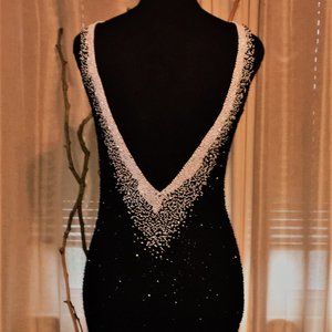Beautiful Beaded Low Cut Back V backout form fitting with lining evening mermaid shape gown. Missing minor beaded under arm. Easy replacement or fine like it is. No one will notice. It has to do with moving of arms constantly on dress. Great for wedding guest, prom or to a special black & white affair, or my favorite Theater wear. Please feel free to ask questions. This dress is selling for $1400-$1500 online right now.