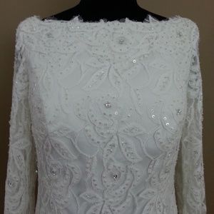 Jovani destination bridal /rehearsal dinner dress. Ivory lace with a sprinkling of sequin sparkle. Lace bell sleeve, back zipper, fully lined. Dress is from local boutique retirement sale. Jovani Size 8 (36-29-39.)NWT