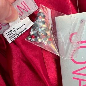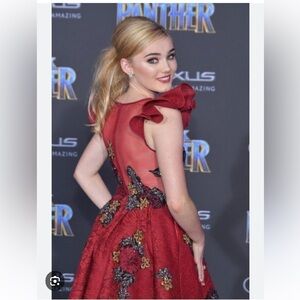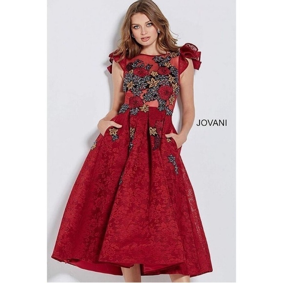 Midi/tea length. Deep red lace and mesh with stones on the floral detail. Back zipper closure. Lined.