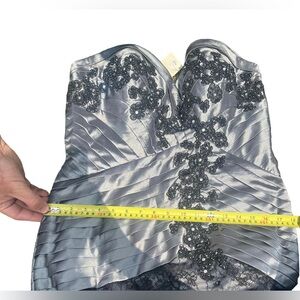 This elegant Jovani gown is a timeless piece perfect for formal events, proms, or galas. It features a strapless sweetheart neckline, beautifully accented with intricate beading and lace appliqué. The fitted bodice transitions into a flared skirt with a subtle mermaid silhouette, giving a flattering and graceful shape. The gown’s black and silver detailing adds a touch of glamour, making it a standout piece for any occasion. Brand new and never worn, this gown is ready to make a stunning impression.