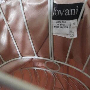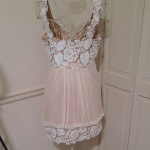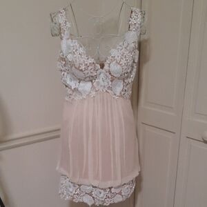 Delicate floral lace chemise by Jovani. Features intricate lace overlay and soft fabric. Perfect for a luxurious night.