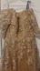 Chic gold midi dress with floral lace. Off-shoulder design. Perfect for elegant events.