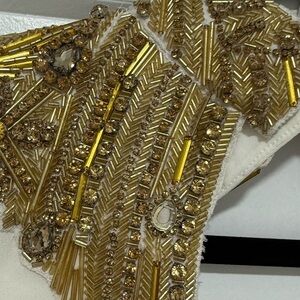 Jovani Ivory Long Sleeve Gown with Gold Beaded Collar