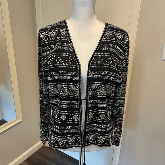 Jovani New York 100% Silk Black Beaded Formal Jacket with tie front, Size M/L? (no size on tag but see measurements below)
