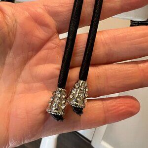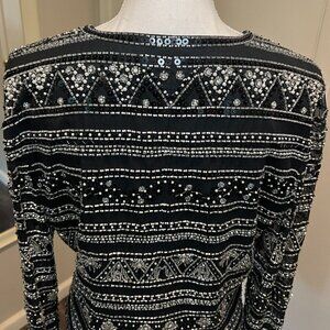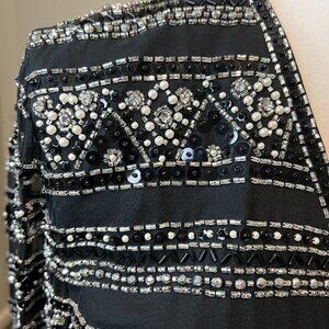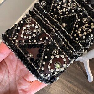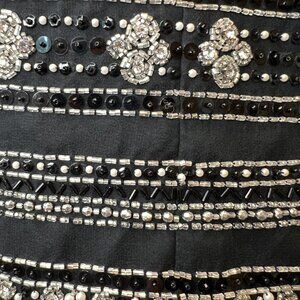black background with intricate beadwork in silver and black with rhinestones and pearls all in great condition