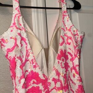 Perfect for homecoming! Material has a slight stretch. My daughter is normally a 4/6, but had to size up in this. No visible missing sequins. Only worn once on stage!