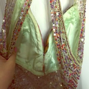 Stunning floral watercolor gown with a mint green underlay! Beautifully colored sequins on a sheer material on the torso and straps. Got this dress altered to my body - 5'3, 135 lbs. The bust area is lightly padded and stitched slightly as shown in the last picture. I wore about 2.5 inch heels with this and they were perfect. Only worn once - amazing condition!
