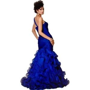 Dazzle in this vibrant one-shoulder chiffon gown! The long bodice features incredibly flattering shirred, crisscross panels creating a gorgeous silhouette. The ruffled layers of the full skirt complete the elegant look of this dress