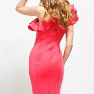 Jovani 59910 Watermelon fitted one shoulder knee length dress.