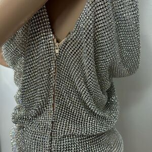 Short sleeve crystal embellished cocktail dress features a plunging neckline and a cowl neckline