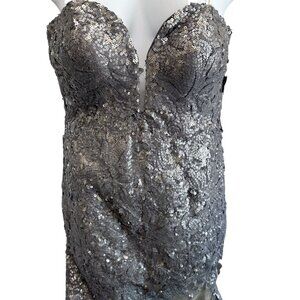 Jovani Silver Sequin Lace Mermaid Gown Plunge Sweetheart Illusion Prom Dress 6