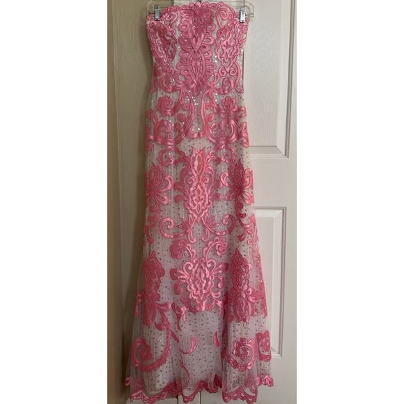 Jovani Strapless Long Gown Pink Ribbon White Layers Sequins 0