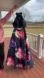 Stunning gown with a navy halter top and vibrant floral skirt with pockets.