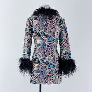 This dress by Jovani 09818 is the perfect combination of sexy and sophisticated. This multicolored cocktail dress is embellished with Aztec beadwork along its fitted silhouette and ostrich feathers on the high neckline and cuffs. This trendy short dress has long sleeves and a closed back. The dress can be worn for many occasions such as a night out with friends, a wedding, or a prom.