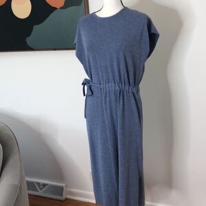 Gorgeous powder blue sweater dress. Cinched tie waist. Lightweight, stretchy and comfortable. Material is extremely soft! This was purchased from a boutique and worn once. Excellent condition. No flaws are noted. I am 57 and the length hits me mid calf. Size medium/large