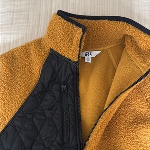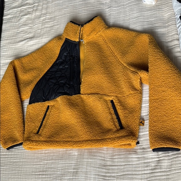 Cozy yellow fleece pullover with black accents. Features a half-zip design and front pockets. See pictures for small details.