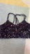 Stylish sports bra with a black and white pattern. Features strappy back design.