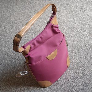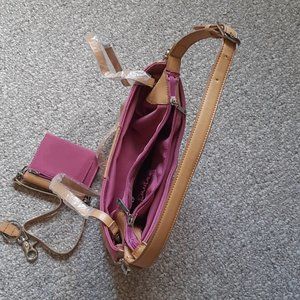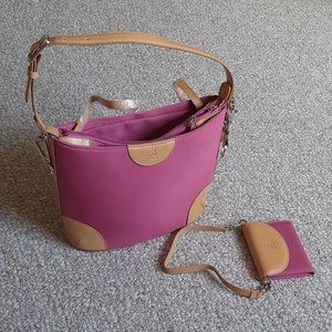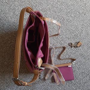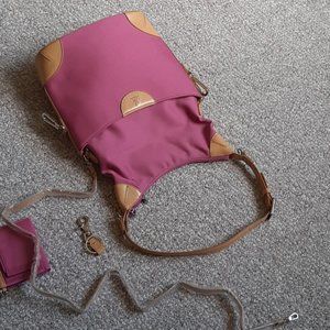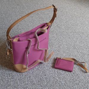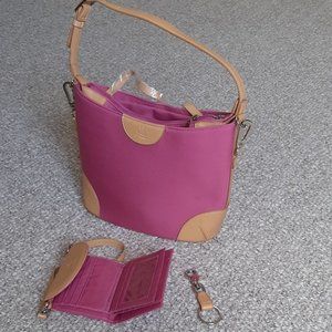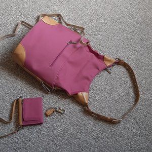 Joy Mangano Rose-pink Expandable Purse-Shoulder Bag, Wallet, and Key-chain set with belt style shoulder handle and a crossbody strap in like-new condition.