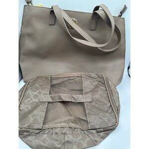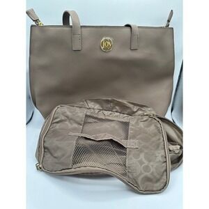 Joy Mangano leather travel tote in tan with matching zippered tote inside.
