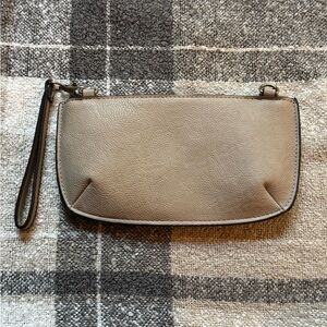 Elegant beige clutch by Joy Susan. Perfect for versatile use. Features a sleek wrist strap.