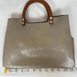 Vegan leather, faux leather, khaki, taupe, shopper bag, tote, satchel, wood handle, top handle, vintage style, modern, minimalist, conscious fashion, sustainable, ethical, animal-friendly, structured, spacious, everyday bag, work bag, casual chic, versatile, timeless, neutral, pre-owned, excellent condition, unique, statement piece, fashion, accessory, Poshmark,