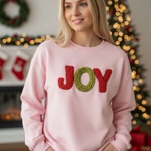 Add a touch of handmade warmth to your holiday creations! This delightful Sweatshirt features the word "JOY" in a wonderfully chunky knit texture, with the "O" cleverly shaped like a festive wreath.