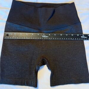 black ribbed bike shorts. High-waist for a flattering fit. Ideal for workouts or casual wear.