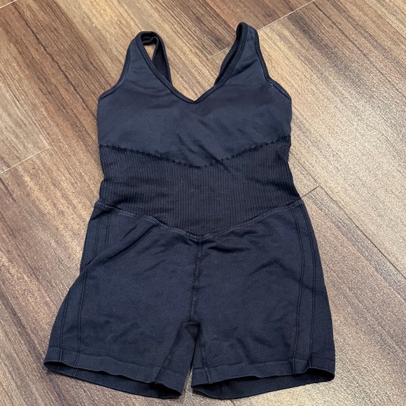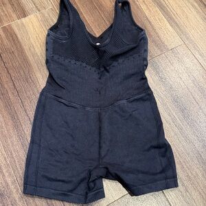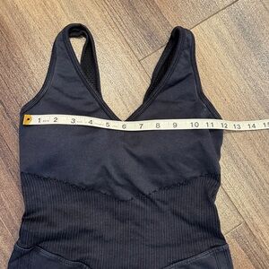 Black JoyLab one-piece with ribbed midsection. V-neck front and wide straps. Stretchy, form-fitting fabric. Ideal for workouts or layering.