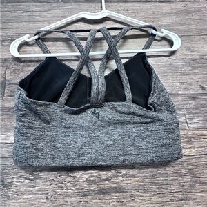 Stylish gray sports bra. Features strappy back design. Comfortable and supportive.