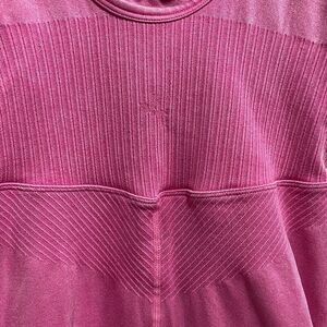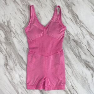 Seamless pink one-piece activewear romper designed for both workouts and lounge. Made with a sculpting ribbed knit and built-in shelf bra and padding. Lightweight and supportive with four-way stretch.