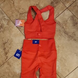Two-piece athletic set with a ribbed texture. High-waist shorts and matching racerback sports bra. Stretchy, supportive fabric for workouts. Bright, solid color for a bold look.