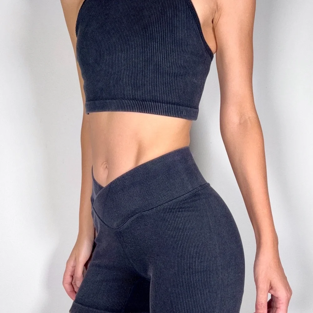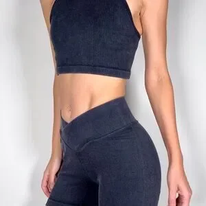 Stylish ribbed set. Includes crop top and high-waisted leggings. Perfect for workouts or casual wear.