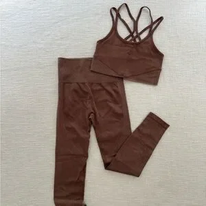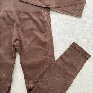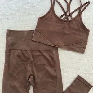 Chic ribbed set with cross-back top and high-rise leggings. Ideal for fitness routines.