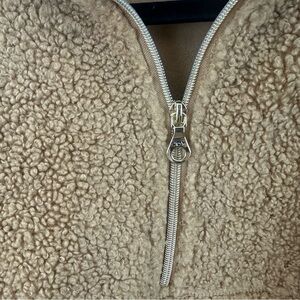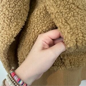 Cozy tan sherpa sweater with zip-up design. Ideal for layering and casual wear.