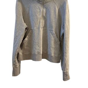 This Joy Lab full zip hoodie in gray is designed for women and comes in a medium size. It features a half-zip front, a comfortable hood, a kangaroo pocket, and ribbed cuffs and hem. Made from a blend of cotton, recycled polyester, and spandex, it offers a regular fit with long sleeves, suitable for casual occasions in the fall. The chest size is 24 inches, and it is machine washable. The hoodie is pre-owned but in excellent condition.