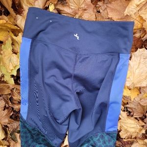 Navy top portion with blue side panels and green with navy floral print at the bottom of the legs.