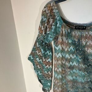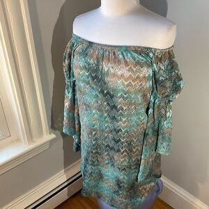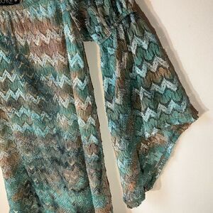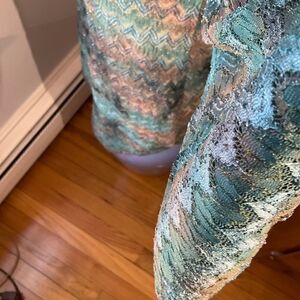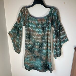 Stunning hippie dress- elasticized scoop neck and back- can be worn off shoulders! Lace overlay, lined bodice. Two tiered puffed balloon sleeves. Green, blue, and tan metallic lace. Straight cut mini. 60’s vibes! Flat lay 33.5” L, 16.5” P-P. 40% poly, 55% nylon, 5% metalic. No rips or tears. TaylorSwift vibes Excellent! 60’s hippie flowerchild #lanadelrey #twiggy #mermaidcore