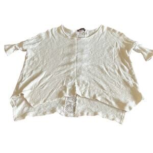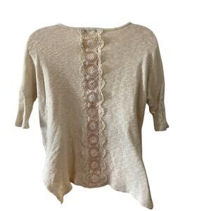 Ivory cream nubby knit top with center back lace inset has asymmetrical hemline and short sleeves