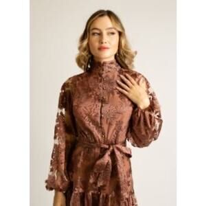 Elegant high-neck lace maxi featuring sheer embroidered overlay, full button front, blouson sleeves, tie waist, and partial lining.