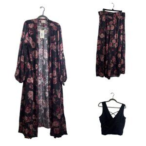 Joyfolie Jenna 3 Piece Set Duster, Top & Pants in Faded Black Floral Size XL NWT