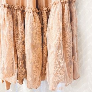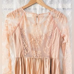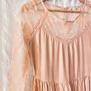 Beautiful maxi length Joyfolie dress with lace arms and top. Not stretchy material, very good quality material with heavier layers on the bottom. No longer on Joyfolie website so I added a similar dress photo to compare!