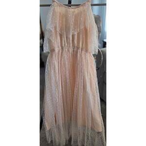 Make any occasion special with this Joyfolie Mia Joy “Lauryn” dress in a beautiful soft sand/nude shade. Featuring delicate polka dot tulle overlay, layered ruffles, and a flowy silhouette, this dress is perfect for weddings, parties, or family photos.