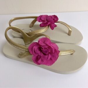 NWOT Joyfolie Pink Flower Embellished Gold Cassia Sandal Fit Flop. Size Girls 3 / 4.