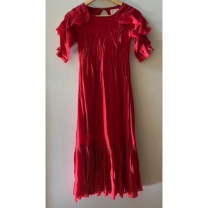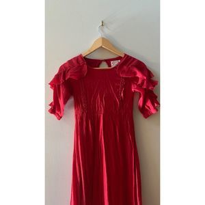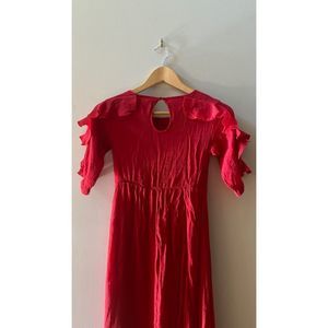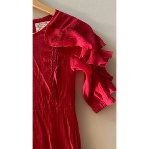 Charming red dress with ruffle sleeves. Perfect for special occasions. Elegant and stylish design.