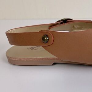 Brown faux leather upper with crisscrossing straps and a striped bow detail. Adjustable ankle strap with a buckle closure.