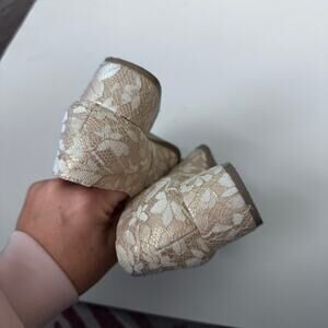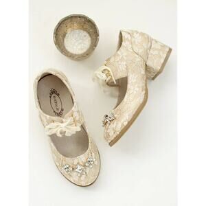 Step out in style with these regal Joyfolie Tribeca booties! These cream-colored booties feature delicate lace and velvet laces, perfect for adding a touch of elegance to any outfit. While they are missing a few rhinestones and were worn once for a wedding, they remain in great condition and ready for their next special occasion.